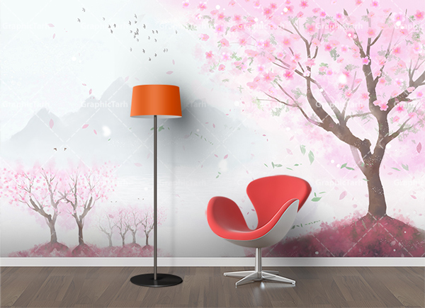 دانلود طرح پوستر کاغذ دیواری لاکچری گل های صورتی در زمینه طبیعت بهاری درختان با شکوفه