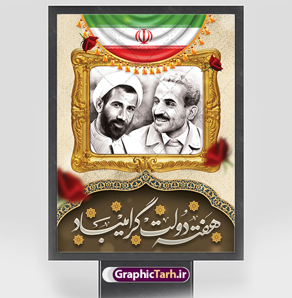 - همانطور که مشاهده می کنید نمونه طرح هفته دولت دارای تصویر شهید رجایی ، شهید باهنر ، گل و خوشنویسی میباشد.