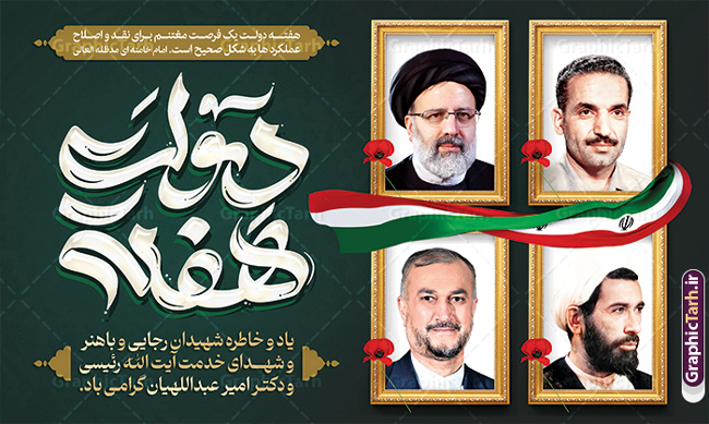 بنر جایگاه هفته دولت با عکس شهدای خدمت شهید رئیسی و شهید دکتر امیر عبداللهیان