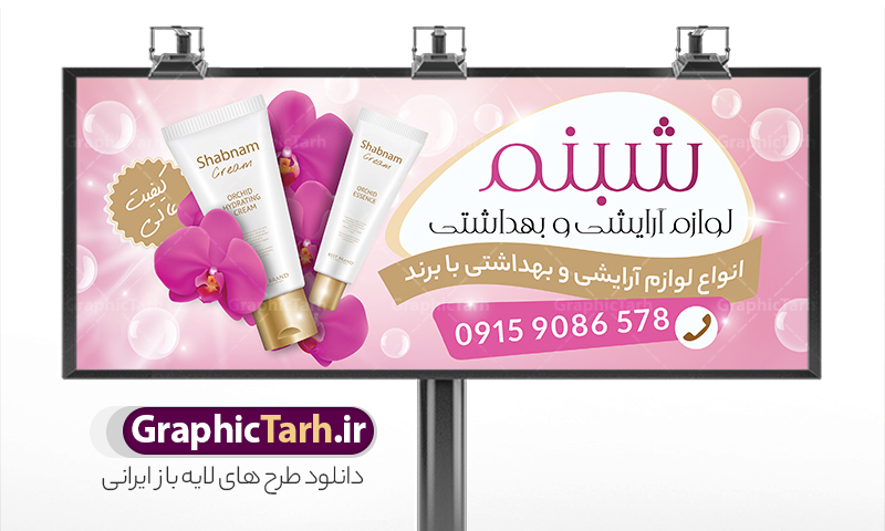 نمونه فایل تابلو فروشگاه لوازم آرایشی و بهداشتی لایه باز و قابل ویرایش با عکس لوازم آرایش