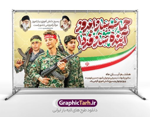 - فایل طراحی گرافیکی بنر بیلبورد روز بسیج دانش آموزی با فرمت PSD در نرم افزار فتوشاپ که قابلیت تغییر سایز را نیز دارد.