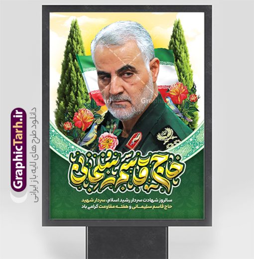- طرح پوستر لایه باز سالگرد شهادت سردار سلیمانی در سایز استاندارد و با طراحی زیبا را از سایت گرافیک طرح دانلود نمایید.