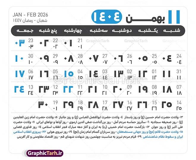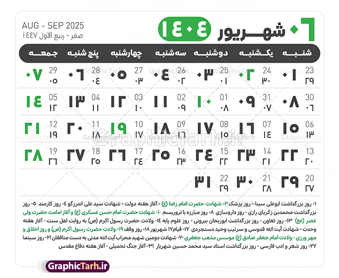 - فایل تقویم خام سال 1404 هجری شمسی مناسب برای استفاده در تقویم دیواری و تقویم رومیزی سال 1404 و … می باشد.