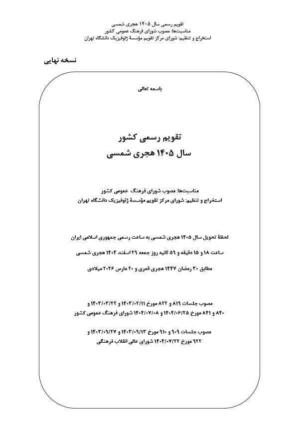 - تقویم رسمی سال 1405 هجری شمسی از سوی موسسه ژئوفیزیک دانشگاه تهران منتشر شد.