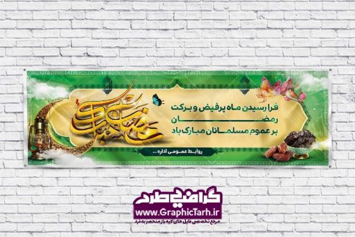 - طرح تابلو تبریک ماه رمضان در ابعاد ۳ در ۱ متر ، با رزولوشن ۷۲ و بصورت افقی که از سایت گرافیک طرح قابل دانلود می باشد.
