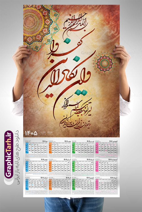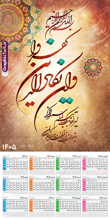 طراحی لایه باز تقویم دیواری تک برگ سال 1405 طرح آیه شریفه وان یکاد با حروف نگاری
