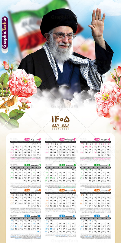 فایل تقویم دیواری 1405 شامل تصویر مقام معظم رهبری حضرت امام خامنه ای لایه باز و با قابلیت ویرایش