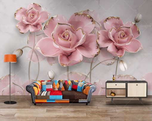 دانلود فایل پوستر لایه باز کاغذ دیواری سه بعدی گل های برجسته صورتی و طلایی
