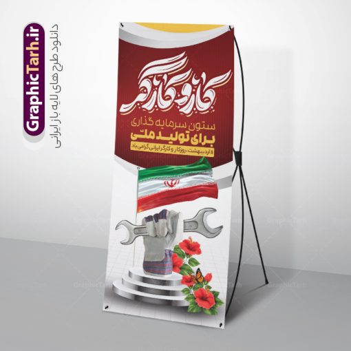 - همانطور که مشاهده می کنید طرح بنر استند روز کارگر دارای تصویر کارگر ایرانی ، گل و خوشنویسی روز کارگر میباشد.