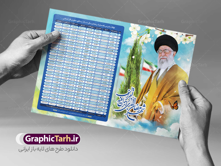 دانلود طرح تراکت لایه باز جدول انتباه اوقات شرعی ماه مبارک رمضان سال 1402 امام خامنه ای psd