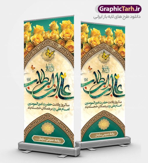نمونه طرح بنر استند ولادت علی بن ابیطالب حضرت امام علی (ع) با تایپوگرافی
