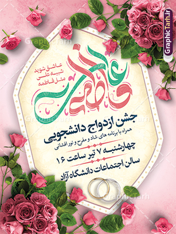 دانلود طرح بنر لایه باز اطلاعیه مراسم جشن ازدواج دانشجویی و با پوستر تایپوگرافی علی و فاطمه