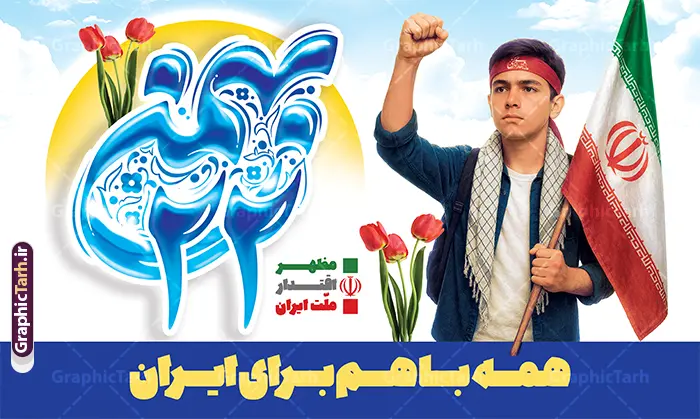طرح بنر اطلاعیه حضور سراسری در راهپیمایی یوم الله 22 بهمن با متن همه با هم برای ایران