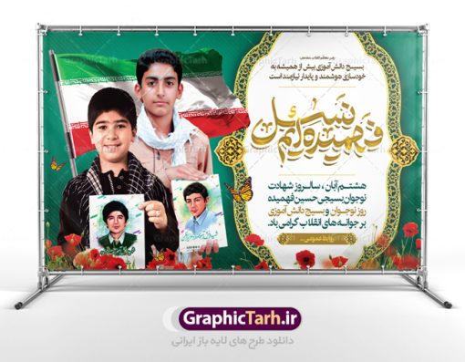 دانلود طرح لایه باز بنر جایگاه سن تبریک روز نوجوان و بسیج دانش آموزی و پوستر طراحی 8 آبان سالروز شهادت شهید فهمیده