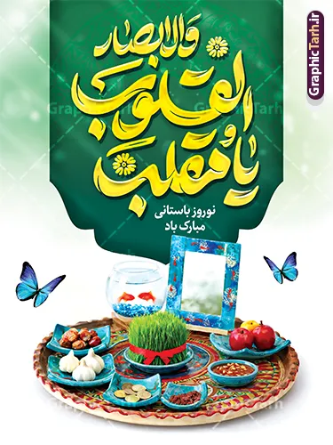 نمونه طرح بنر خام عید نوروز با تایپوگرافی یا مقلب القلوب و الابصار و عکس سفره هفت سین psd و قابل ویرایش