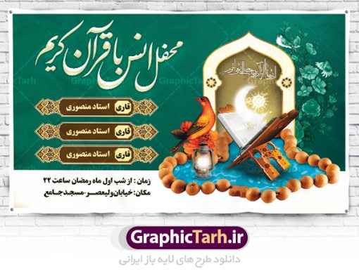 - فایل بنر انس با قرآن در ابعاد لارج 5 در 3 متر با رزولوشن 72 مناسب جایگاه مراسم جز خوانی که از سایت گرافیک طرح قابل دانلود می باشد.