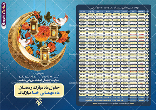 - دانلود طرح تبلیغاتی اوقات شرعی ماه مبارک رمضان 1403 در ابعاد استاندارد A4 و با رزولوشن 300 از سایت گرافیک طرح قابل دانلود می باشد.