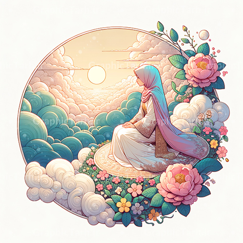 دانلود طرح تصویر کاراکتر کارتونی هوش مصنوعی دختر با حجاب مسلمان در میان گل ها و فضای ابر و آسمان و عکس باکیفیت تصویرسازی دختر باحجاب ایرانی با کیفیت بالا
