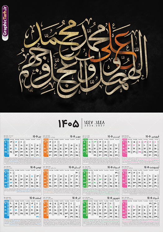 • این طرح دارای تصویر حروف نگاری صلوات و جدول تقویم لایه باز سال 1405 است.