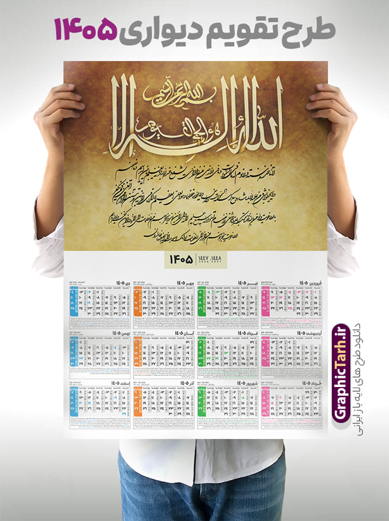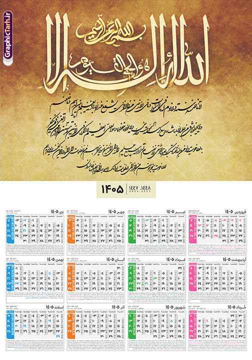 طرح تقویم لایه باز و خام دیواری سال 1405 با حروف نگاری آیت الکرسی
