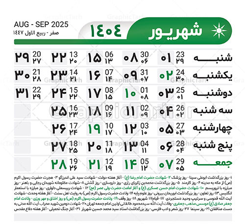 لطفا قبل از چاپ در تعداد بالا ، تقویم را کامل بررسی و سپس اقدام به چاپ کنید. در صورت بروز اشتباه در تقویم ، هیچ مسئولیتی متوجه گرافیک طرح نمی باشد.