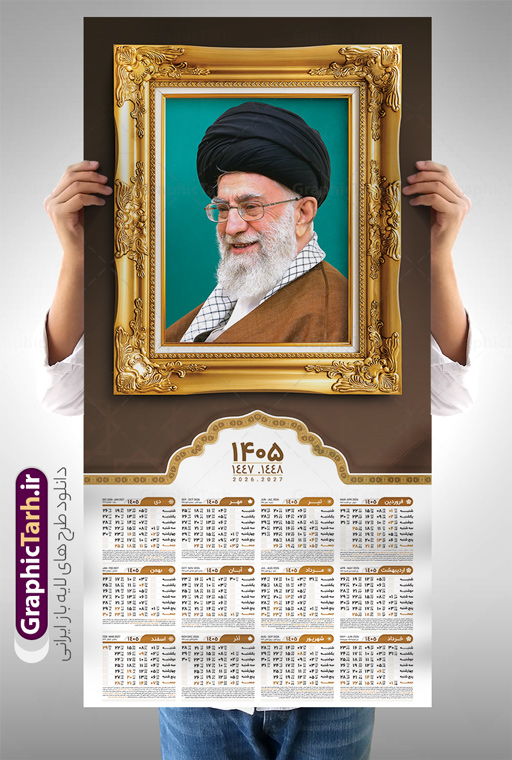 فایل طرح تقویم دیواری 1405 با تصویر مقام معظم رهبری حضرت امام خامنه ای لایه باز و psd