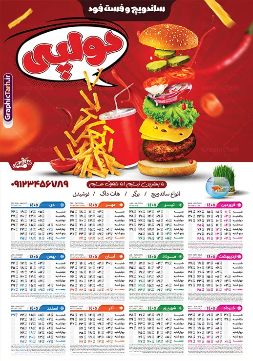دانلود طرح تقویم دیواری سال 1405با تبلیغات فست فود و ساندویچی با قابلیت ویرایش المان ها لایه باز و psd