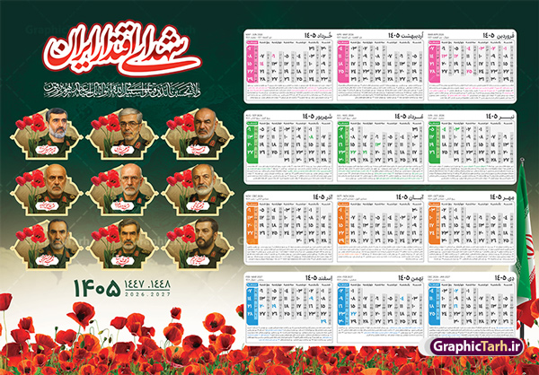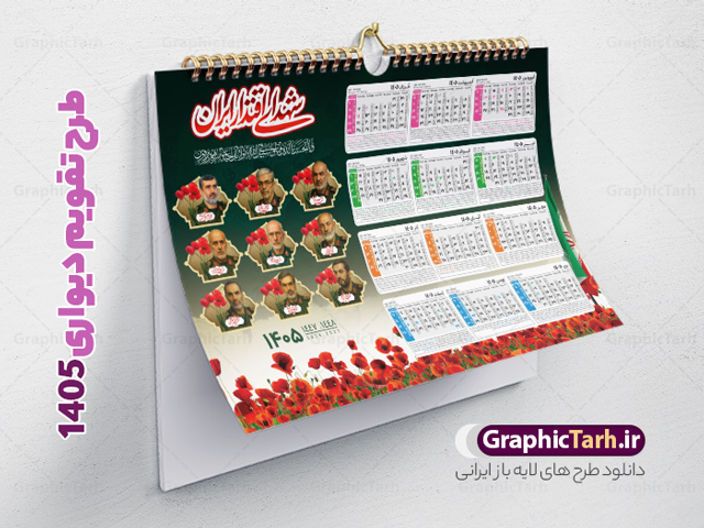 نمونه تقویم دیواری شهدا سال 1405 لایه باز و دارای عکس شهدای اقتدار ایران و فرماندهان و سرداران سپاه