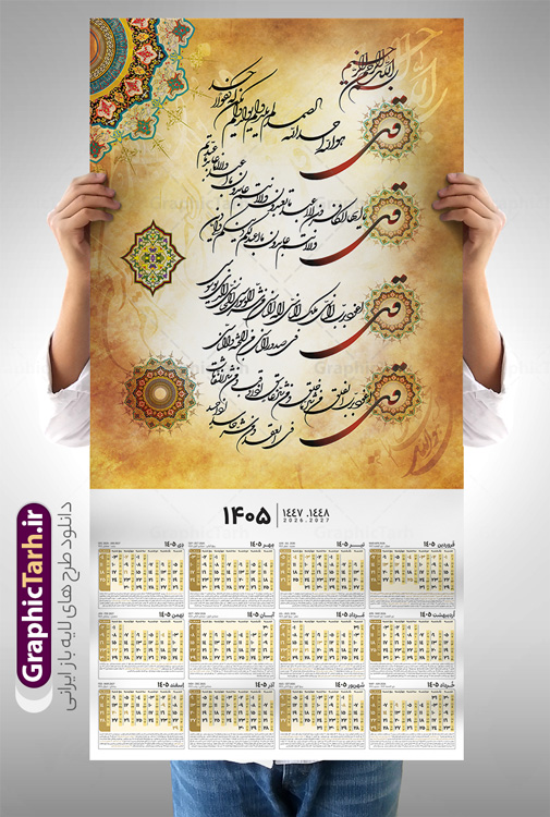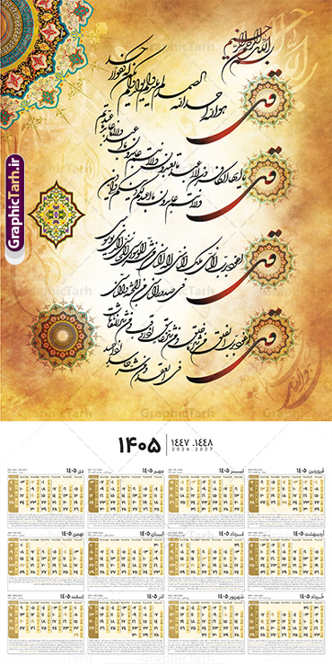 دانلود طرح آماده تقویم دیواری مذهبی سال 1405 با طراحی لایه باز دارای خوشنویسی چهار 4 قل بصورت تک برگ با قابلیت ویرایش