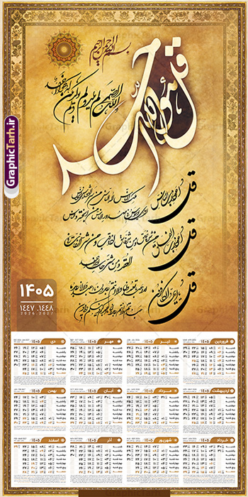 طرح تقویم دیواری مذهبی 1405 با خوشنویسی چهار قل