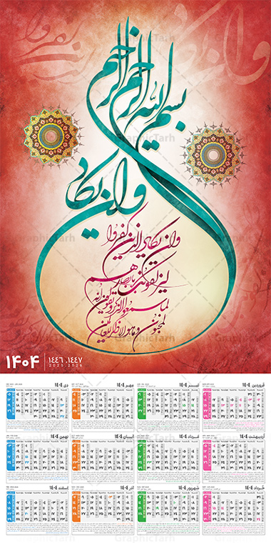 فایل لایه باز تقویم دیواری سال 1404 طرح آیه شریفه وان یکاد با تایپوگرافی