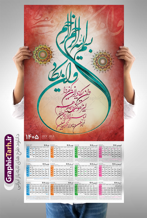 فایل لایه باز تقویم دیواری تک برگ 1405 طرح آیه شریفه وان یکاد با حروف نگاری