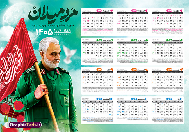 دانلود طرح تقویم دیواری لایه باز سال 1405 با تصویر شهید سردار حاج قاسم سلیمانی شامل فایل psd و خام جدول تقویم ۱۴۰۵ با قابلیت ویرایش در فتوشاپ