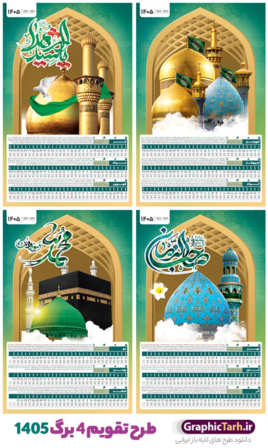 دانلود طرح تقویم 1405 لایه باز 4 برگ با تصاویر مذهبی و قابلیت ویرایش