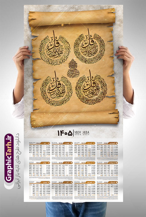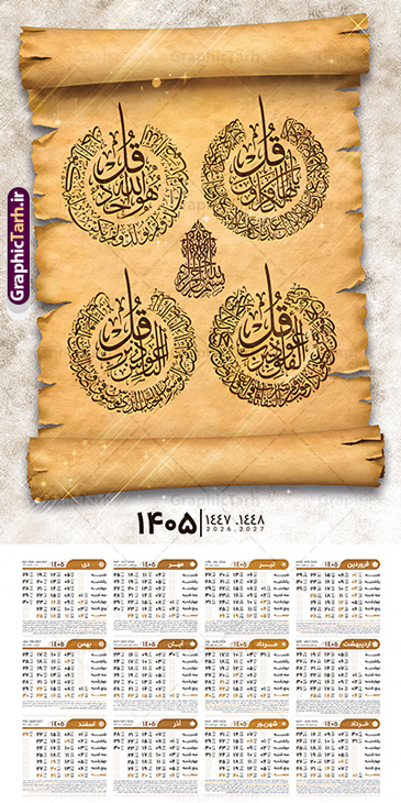 دانلود طرح آماده تقویم دیواری مذهبی سال 1405 با طراحی لایه باز خوشنویسی چهار 4 قل