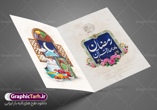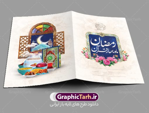 - فایل دعوتنامه رمضان با تصویر قرآن کریم سفره افطاری ساده گل و خوشنویسی کالیگرافی رمضان