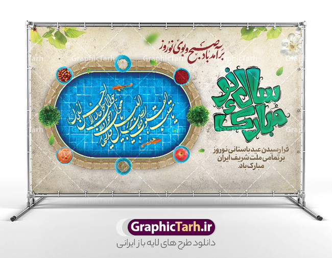 فایل بنر عید نوروز با تایپوگرافی سال نو مبارک و هفت سین psd و حوض ماهی