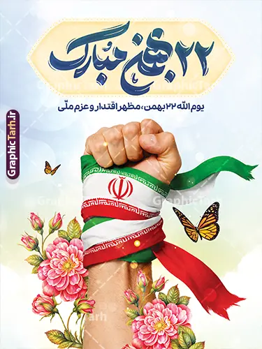 طرح لایه باز بنر 22 بهمن مبارک با عکس پرچم ایران در دست