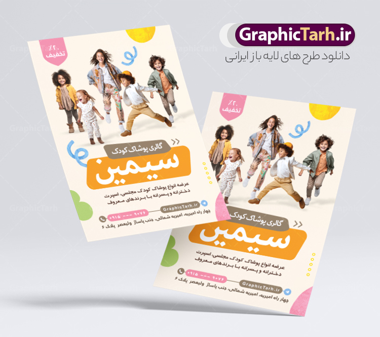 - طرح لایه باز تراکت رنگی فروشگاه لباس کودک با طراحی بسیار زیبا و با کیفیت بالا در اختیار شما عزیزان قرار میگیرد.