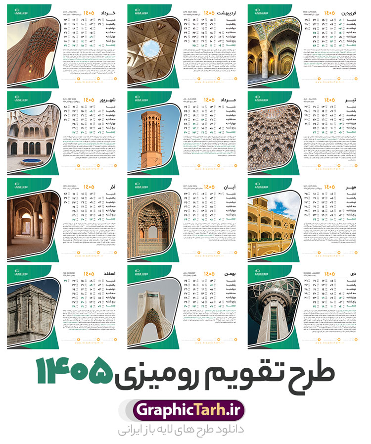 طرح تقویم رومیزی سال 1405 لایه باز و قابل ویرایش دارای 12 برگ و جلد با عکس آثار و بناهای تاریخی ایران