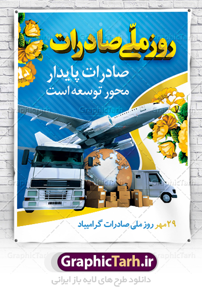 - همانطور که مشاهده می کنید نمونه طرح بنر 29 مهر روز ملی صادرات دارای تصویر حمل و نقل هوایی دریایی ، وکتور ، گل و خوشنویسی میباشد.