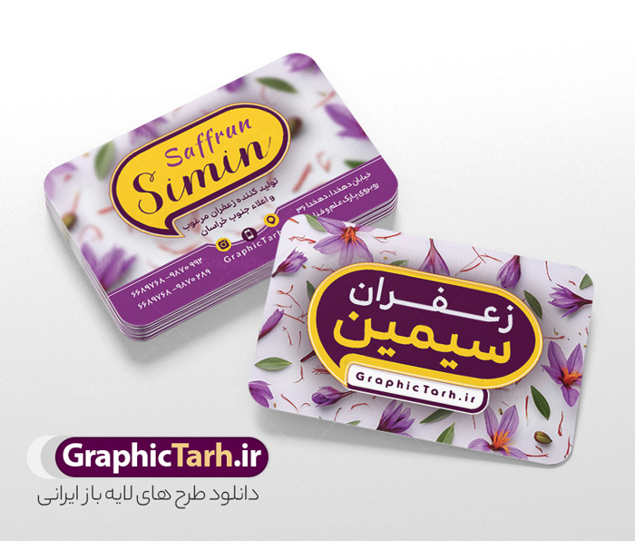 دانلود طرح کارت ویزیت لایه باز فروشگاه زعفران و زعفران فروشی با عکس گل زعفران طلای سرخ و رنگ بنفش و قابلیت ویرایش