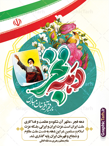 - تصویر دوربری امام خمینی (ره) ، کادر اسلیمی ، خوشنویسی دهه فجر ، گل و مرغ ، پرچم ایران و …