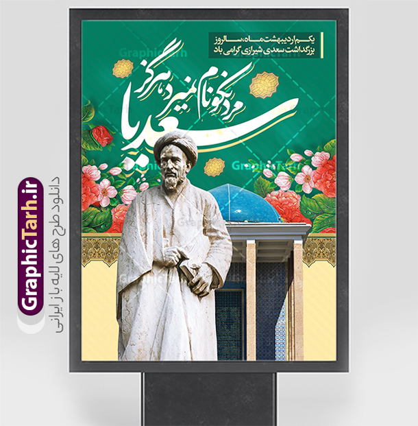 دانلود طرح لایه باز پوستر تبریک 1 اردیبهشت روز بزرگداشت سعدی و بنر عمودی با خوشنویسی شعر سعدی شیرازی سعدیا مرد نکونام نمیرد هرگز