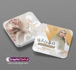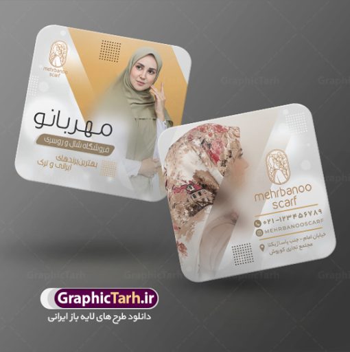- کارت ویزیت فروشگاه شال و روسری دورگرد مربع با طراحی بسیار زیبا از سایت گرافیک طرح قابل دانلود می باشد.