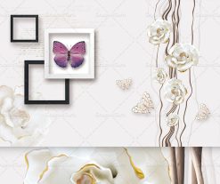 نمونه طرح کاغذ دیواری سه بعدی گل سفید و قاب پروانه