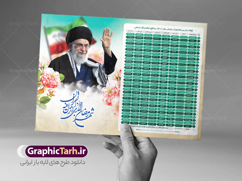 دانلود طرح تراکت لایه باز جدول انتباه اوقات شرعی ماه مبارک رمضان سال 1402 رهبری حضرت امام خامنه ای psd