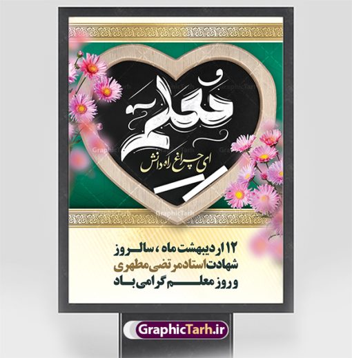 دانلود طرح لایه باز بنر روز معلم و پوستر تبریک 12 اردیبهشت سالروز بزرگداشت شهید استاد مرتضی مطهری با تایپوگرافی معلم ای چراغ راه دانش