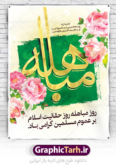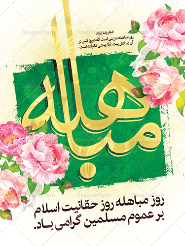 دانلود طرح بنر پلاکارد تبریک فرا رسیدن روز مباهله با تصویر دوربری شده و با کیفیت گل و مرغ اسلیمی