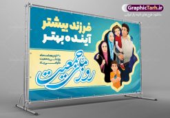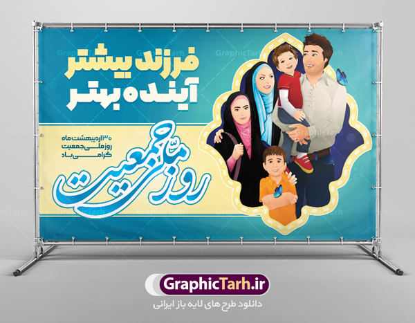- همانطور که مشاهده می کنید طرح بنر روز ملی جمعیت دارای عکس خانواده ایرانی ، وکتور افزایش جمعیت ، گل و خوشنویسی میباشد.